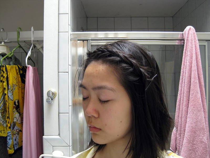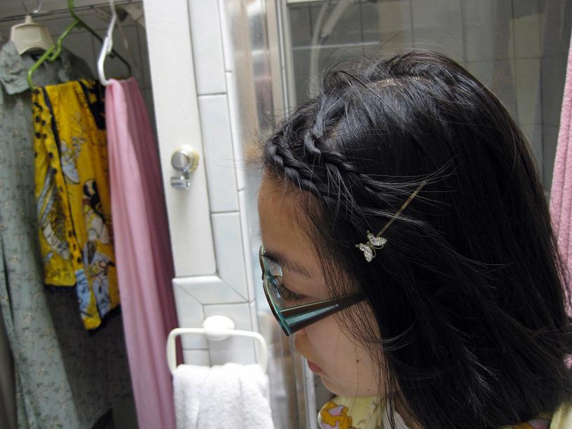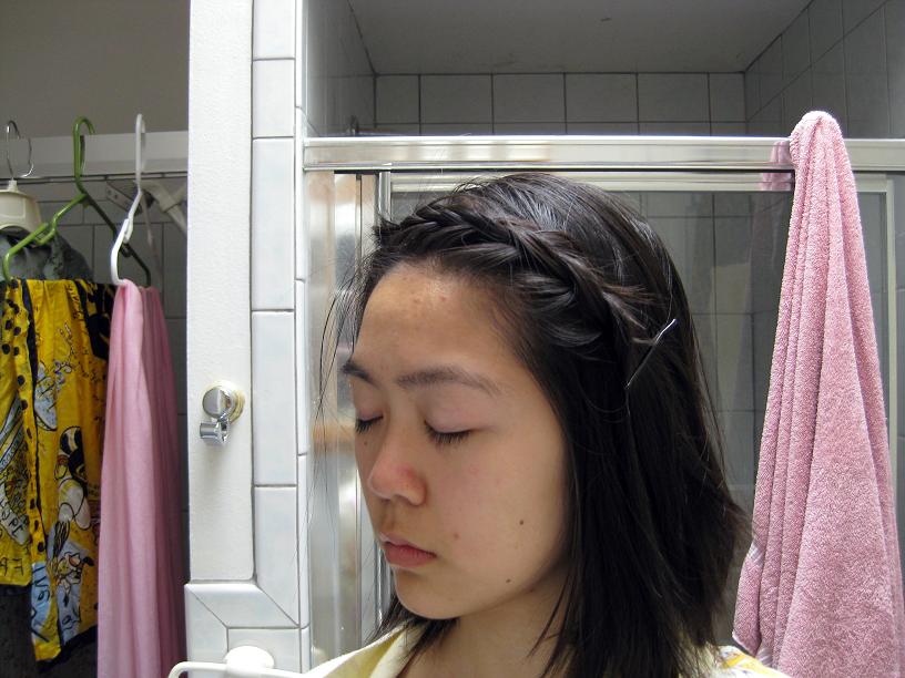 The point is, braid across your scalp, from temple to temple (or ear to ear, whatever suits your face better). (On that note, wear kick-ass glasses. They distract from your hair.)
