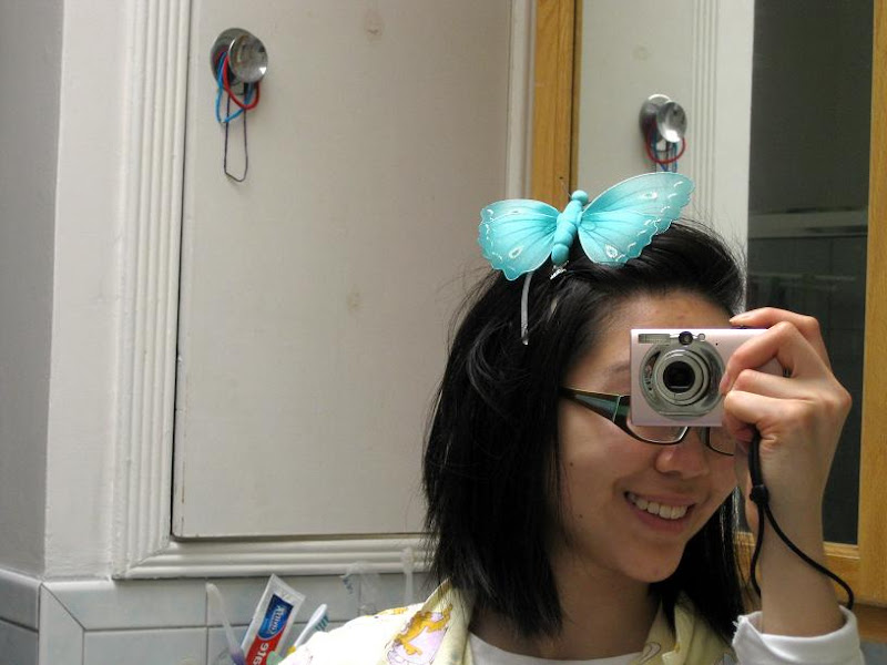 Or you could go the Gaga route and stick crazy things in your hair. Like this butterfly headband that my apartmentmate broke while we were having a midterm dress-up party in the dorms (it's balanced precariously atop my head right now... the other half of the headband is missing):