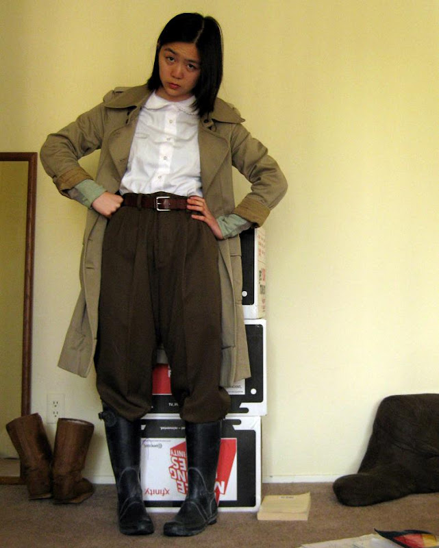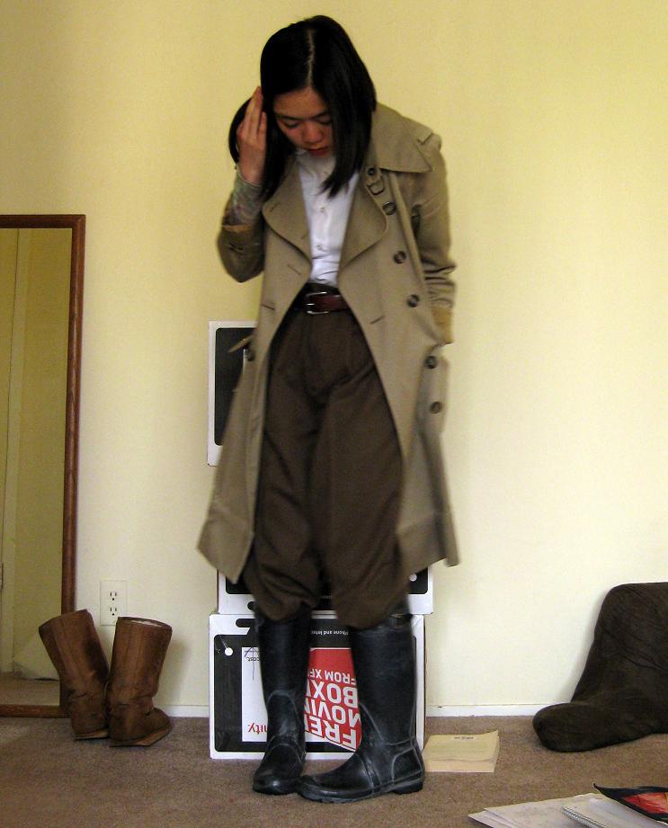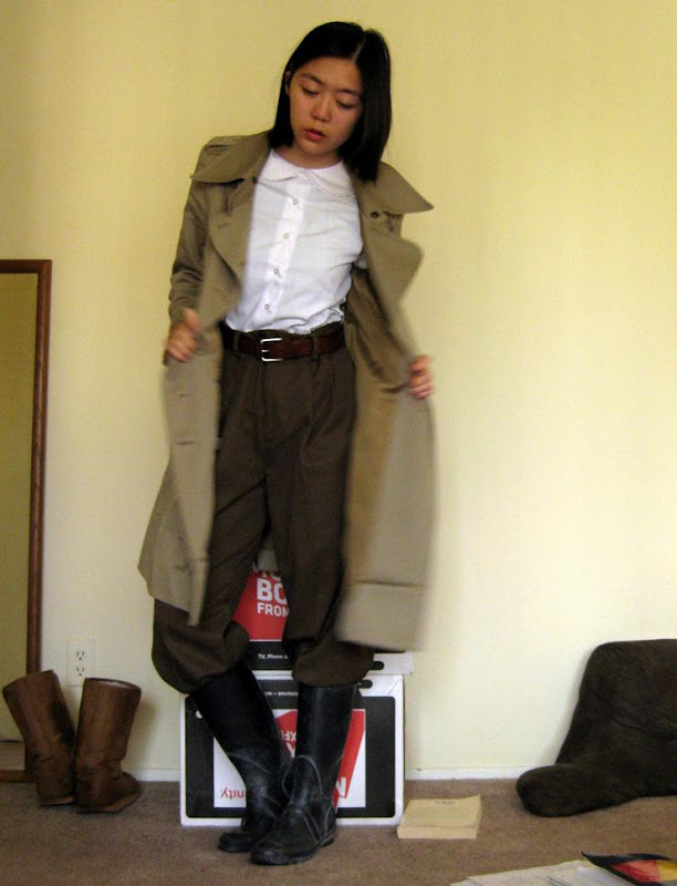 I'm not sure what I was thinking when I put on this moderately unflattering ensemble, but it sure was comfortable. I wore this to take my first final of spring semester from 7 - 10 PM (seriously, Berkeley, talk about scheduling fail) in the rain. I don't think I've worn remotely baggy pants (I don't count my misunderstood harem/hammer pants as pants) since I was 10, when my jeans came from Hong Kong and some kid in my class who could only breathe out of one nostril made fun of the Winnie the Pooh decal on the leg and THAT WAS WHEN IT HIT ME: I should probably think about what I was wearing.