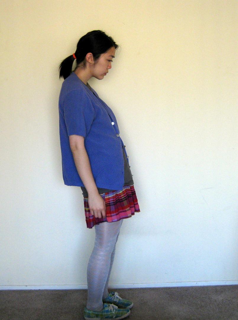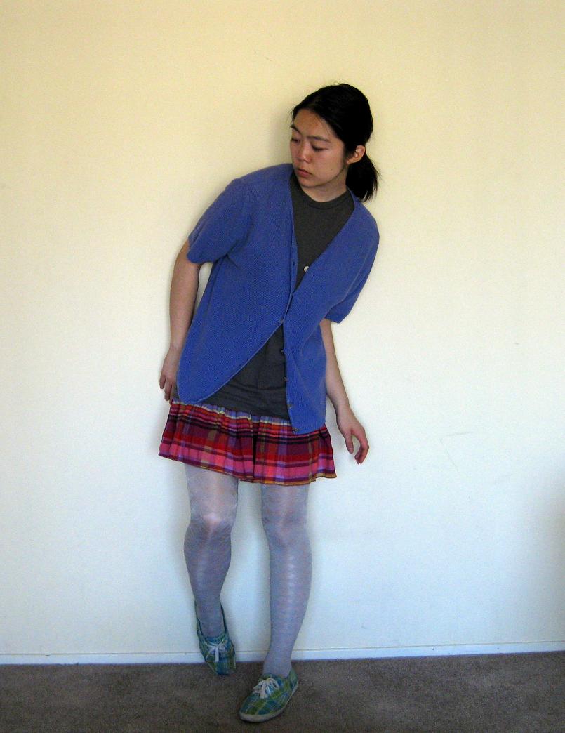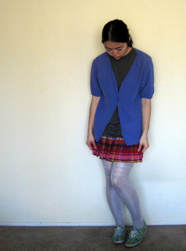 Above, t-shirt: Hanes, men's. Cardigan: mother's. Skirt: Nordstrom Rack. Tights: H&M. Plaid shoes: Keds.