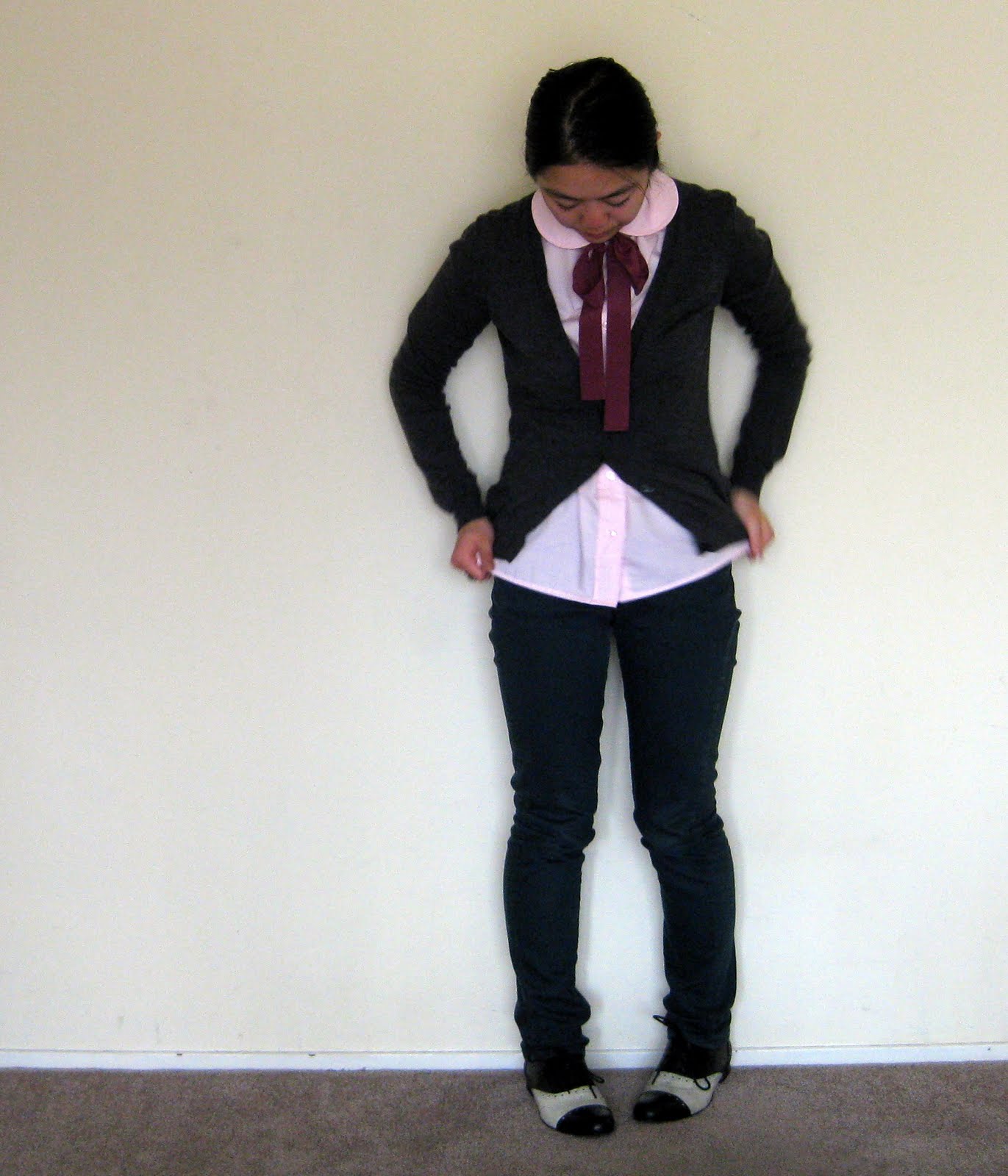 Above, gray cardigan: Uniqlo. Pink Peter Pan collar blouse: French Toast uniforms. Neck tie thing: found it in the closet. Teal jeans: Uniqlo. Black and white oxfords: Miz Mooz.