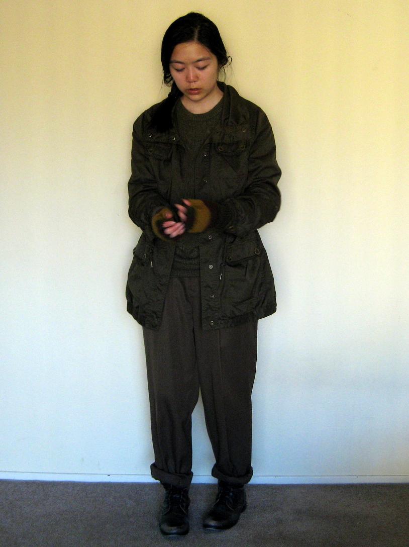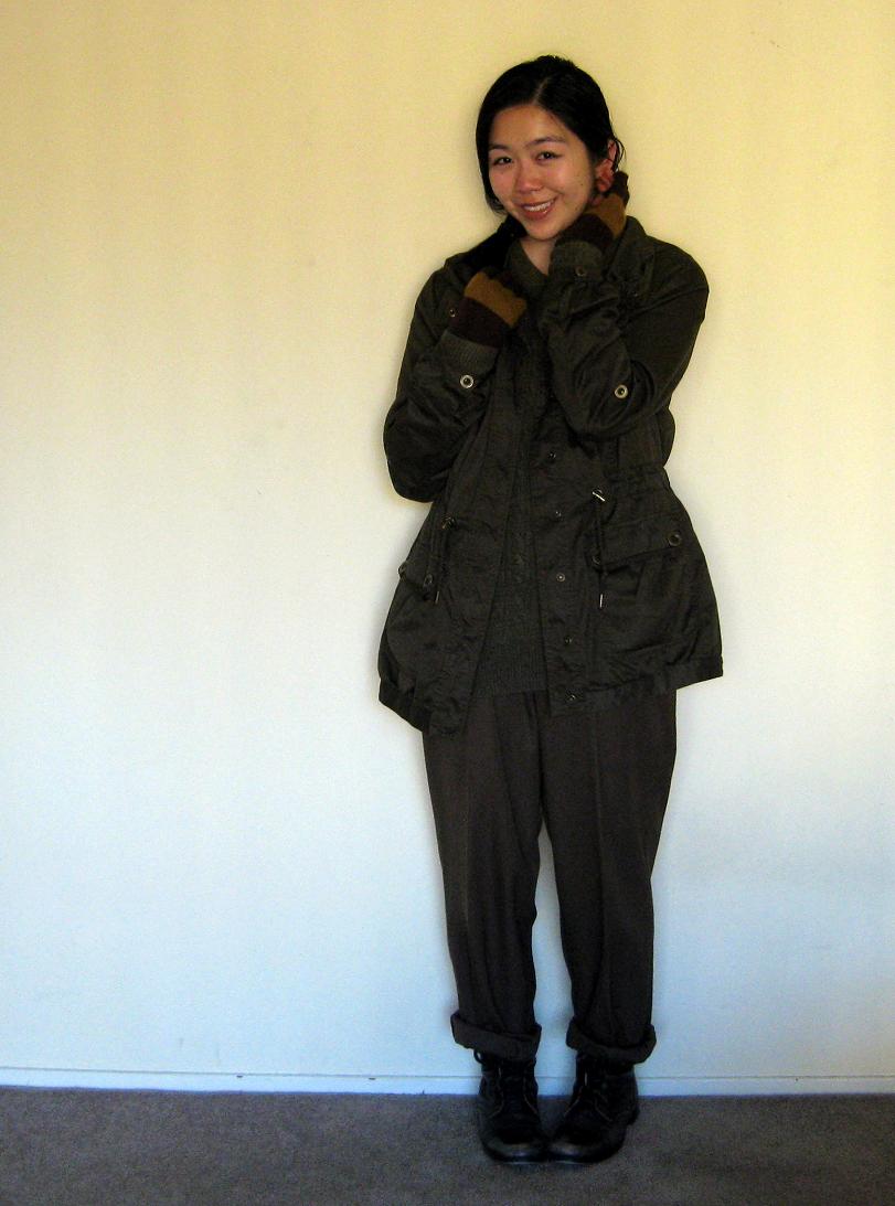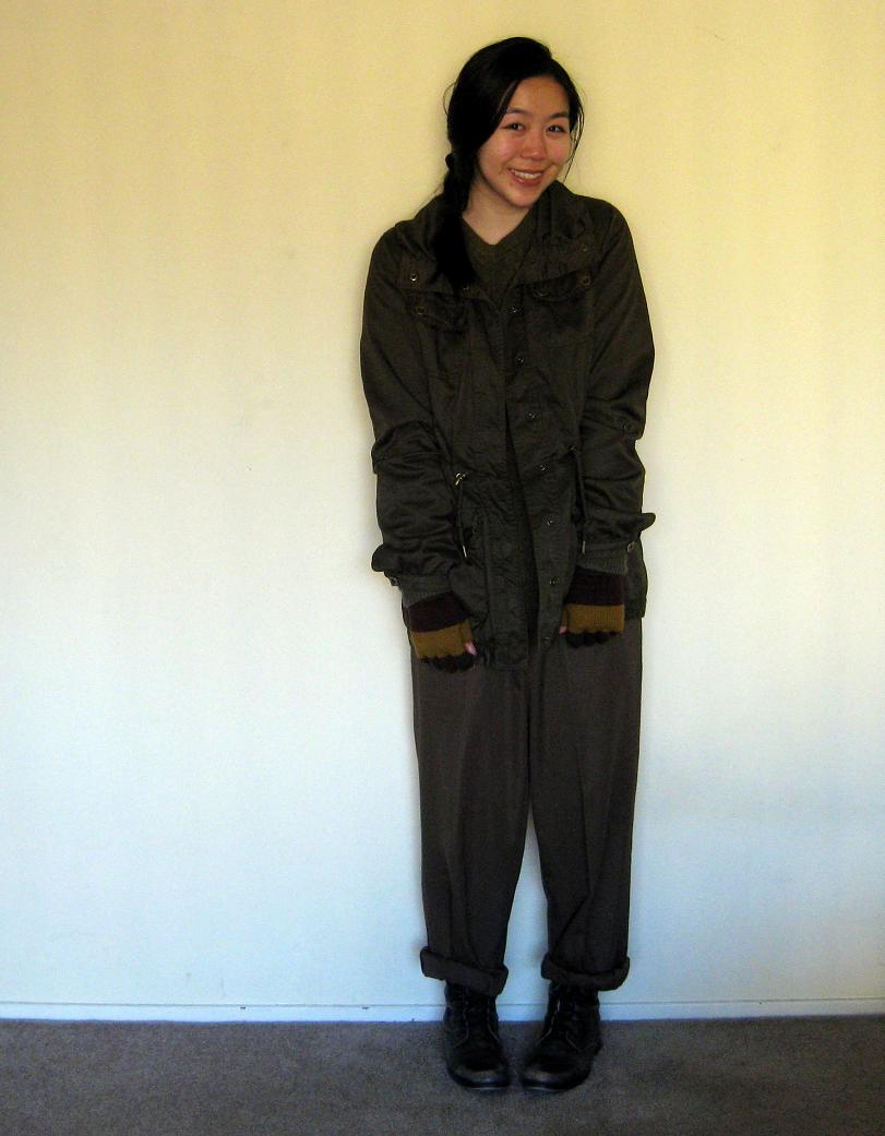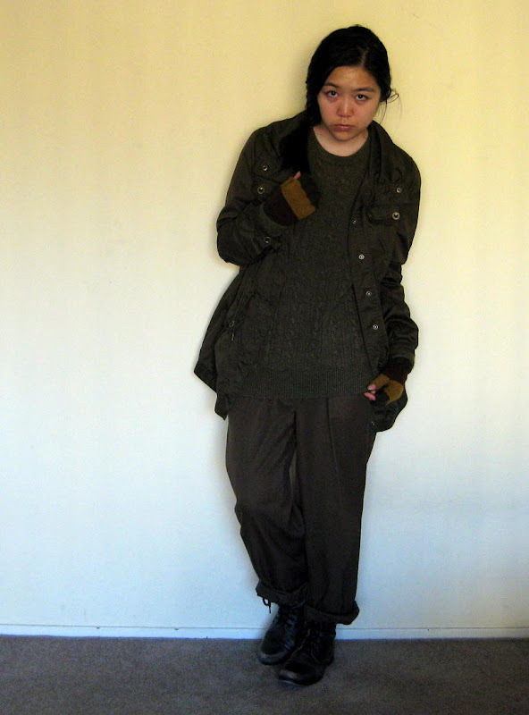 Jacket: mother's, H&M. Sweater: uncle's. Fingerless gloves: Bancroft Clothing Store. Pants: one of my uncles'. Boots: Steven by Steve Madden.I guess I still look like a SLAG.