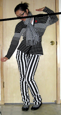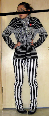 Above, scarf: Haight-Ashbury somewhere. White V-neck: Men's Hanes via Target. Cardigan: grandmother's. Pea coat: Kenneth Cole. Jeans: delia's. Socks: gift from yellow. Flats: Steve Madden via Ross. Red airplane pin: childhood.