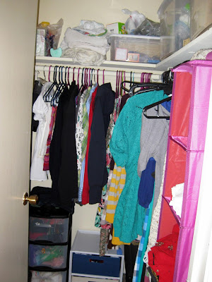 And our closet, which looks very sad and small. My stuff is straight ahead, hers to the right.