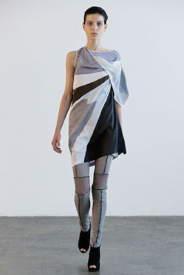 Above, from Jeremy Laing. I don't know what to say about the top except that someone else would wear it better than I could, but I like the weird lines on the leggings and how the horizontal part goes slightly above the knees. They make me think of mosaics, mortar, and stained glass windows (really ugly ones). If these came in tights-form, I would be on them (in them?) in a hot second.