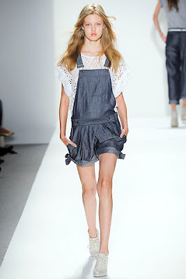 Above, also from Cynthia Steffe. Yes to denim shortalls with baggy legs, yes to that white blouse thing that looks more laser-cut than crochet with huge sleeves (if those count as sleeves).