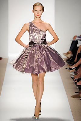Above, from Rodarte. I don't really know how I feel about the whole collection, but I like the Frankenstein way the dresses are put together and the colors and mixture of textures. And that the tribal tattoo makeup was drawn on with marker. And I felt obligated to mention the Mulleavy sisters because they're Cal graduates.