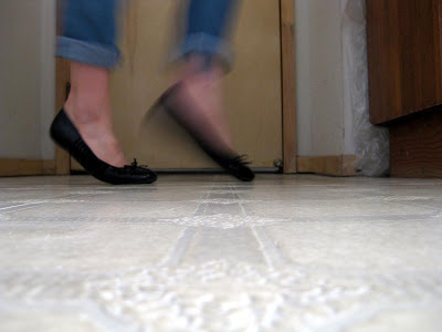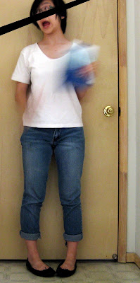 Above, subtle tee: DIY. Cuffed jeans: Levi's + Costco + DIY. Black patent leather flats: Steve Madden via Ross. Frantic gestures: no idea.