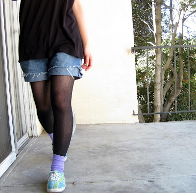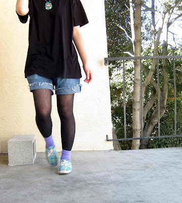 Above, necklace: SoGood. T-shirt: free from [adultswim]. Number-print leggings: H&M. Lavender socks: Nordstrom. Plaid shoes: Keds.