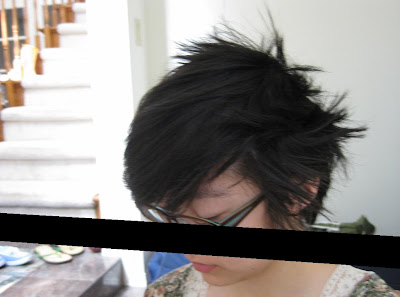 Sometime between just baking soda and just water, I went swimming, necessitating the use of serious shampoo and conditioner. My hair recovered from it well and didn't suddenly get greasy or anything. I also gave myself a drastic haircut because I figured whatever it looked like, it couldn't be worse than 7 days' grease. My crooked pixie-mullet resulted in a newfound desire for grease for styling purposes, and the inability to use the damp-washcloth method (stroking hair from roots to ends with a damp washcloth to redistribute oils), which had never worked very well for me anyway because I pulled out so much hair doing it.