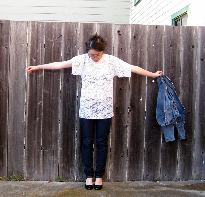 Here's my lace shirt with crooked sleeves. I'd actually planned on making a circular shirt (like a circle skirt, but with more seams to make armholes), but I cut the head hole too big and ... this is the result.