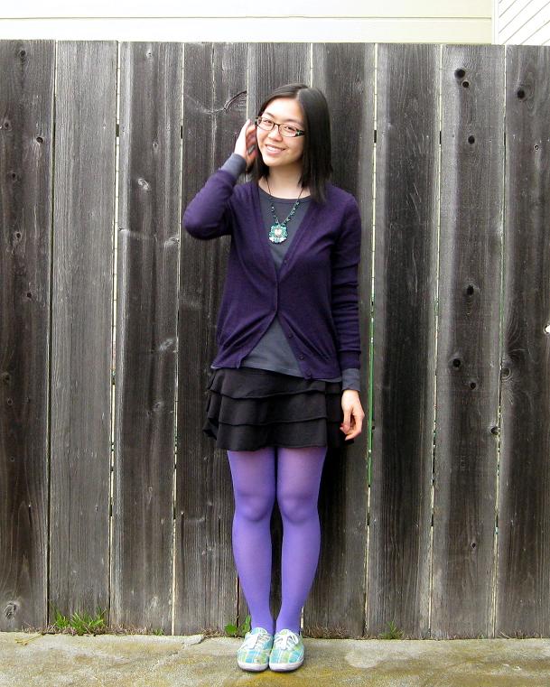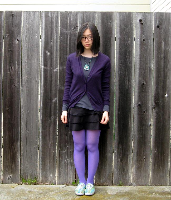 Purple cardigan: Uniqlo. Gray thermal top: Old Navy courtesy of M80. Necklace: SoGood Jewelry. Black tiered miniskirt: secondhand, gift. Purple tights: H&M. Plaid shoes: Keds.