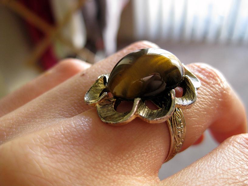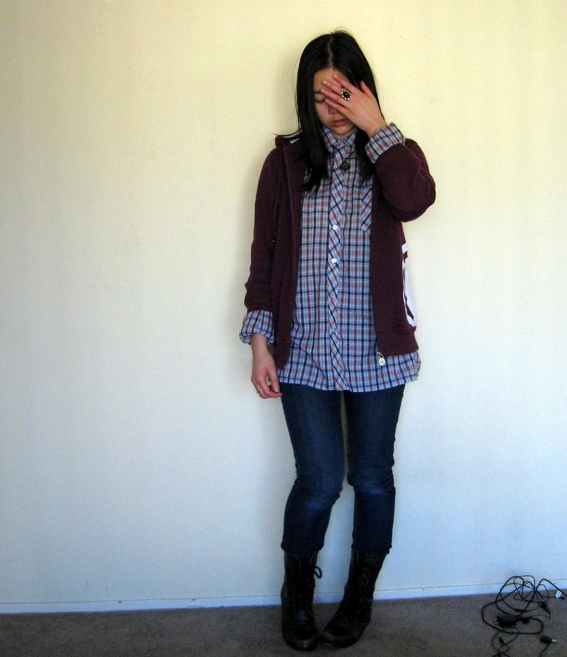 Above, plaid shirt: grandmother's. Hoodie: nomis, gift. Tiger's eye ring: estate sale. Two-finger bird ring: Forever21. Hogwarts crest necklace: Hot Topic. Jeans: Forever21. Boots: Steven by Steve Madden.